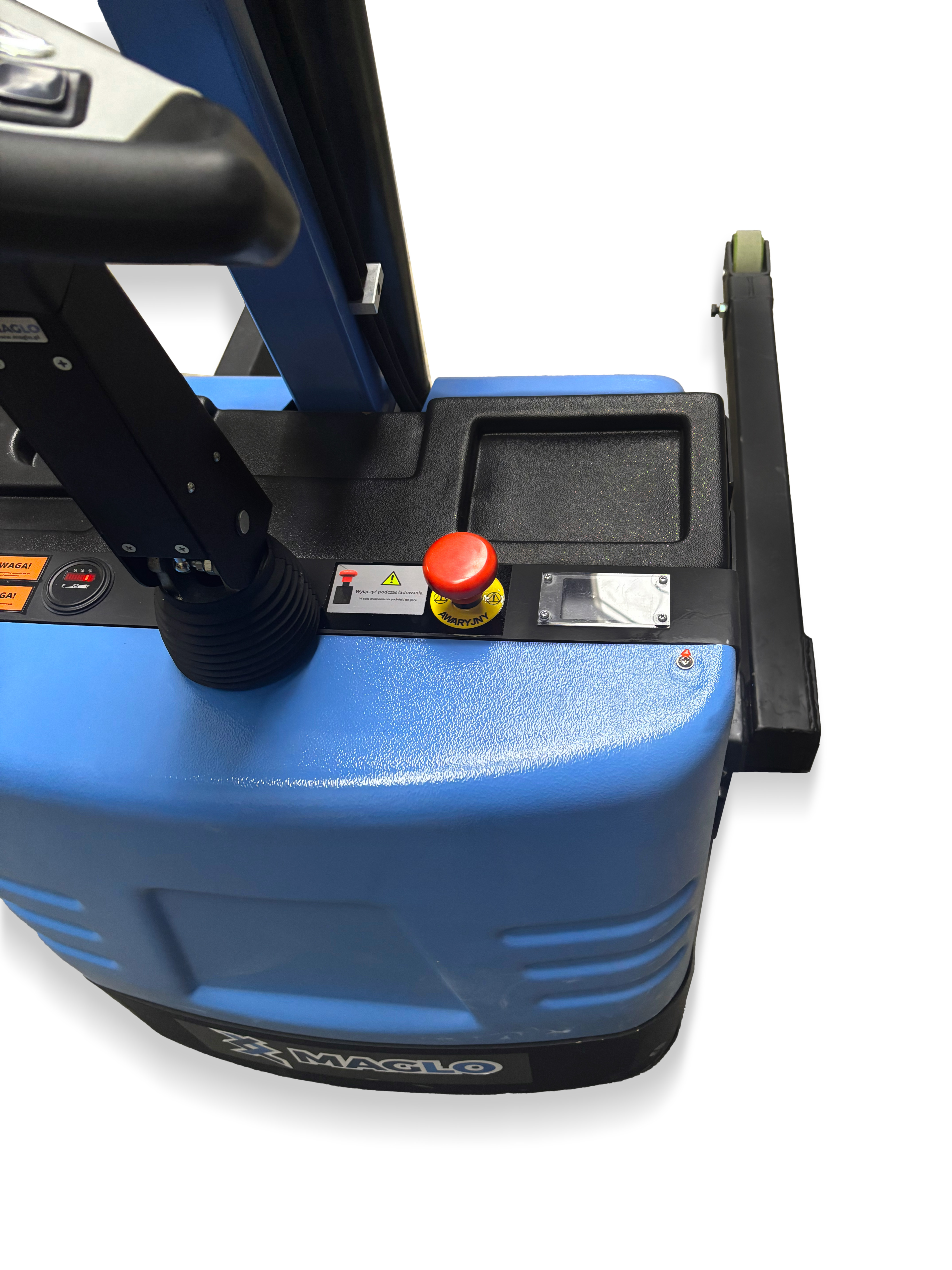 Wyposażony w przyciski podnoszenia/opuszczania, klakson i funkcję łącznika brzusznego, który zapobiega najechaniu na operatora. Zapewnia intuicyjną i bezpieczną obsługę.
